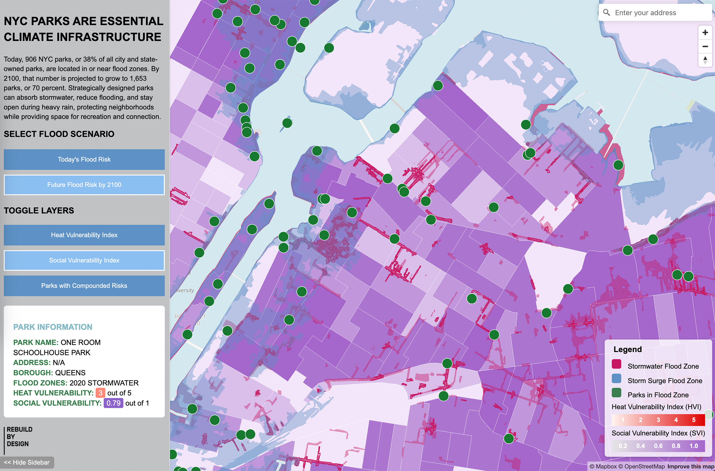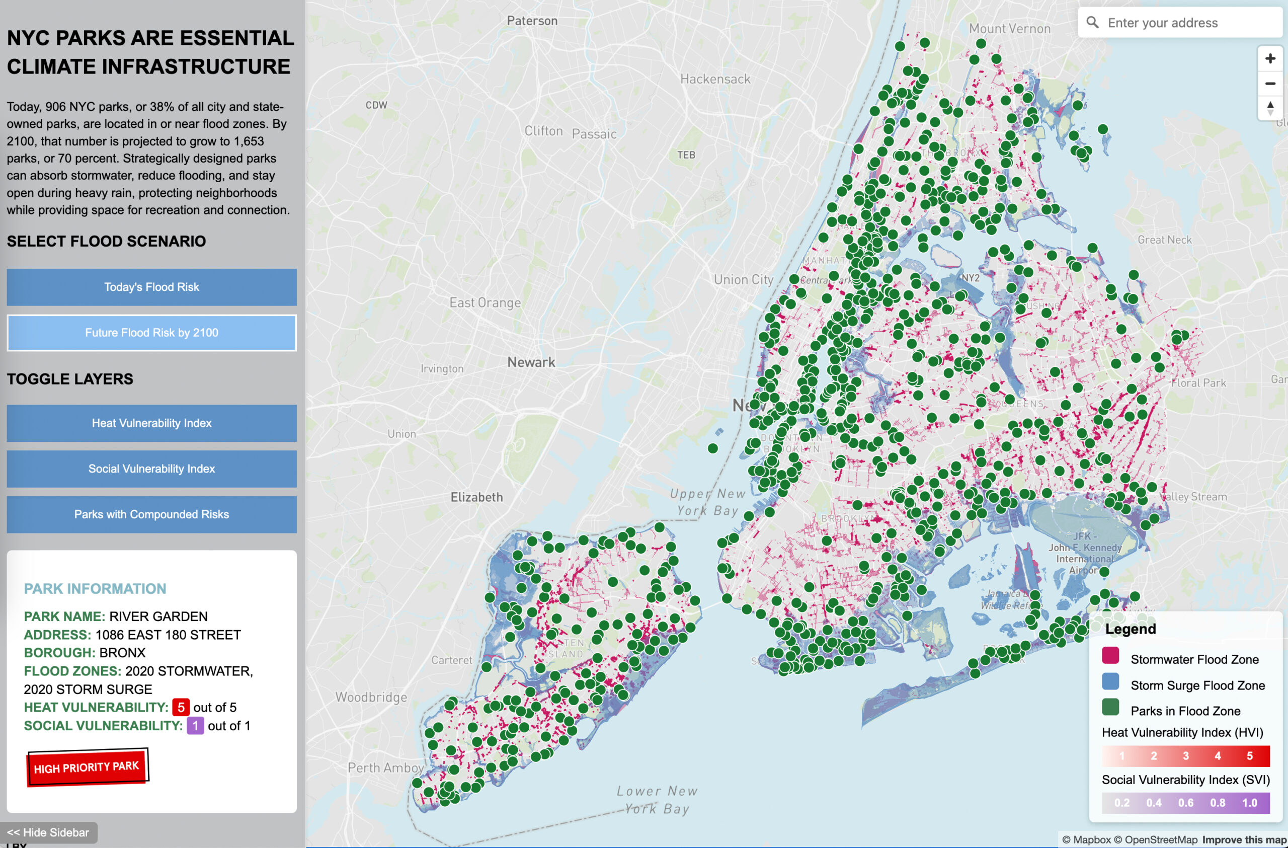 Developed an interactive map and report that reveals how many NYC parks are currently in, or will be in, flood zones and heat risk areas by 2100. The tool identifies high-priority parks in need of climate upgrades and provides city officials, advocates, and planners with evidence to unlock federal and state funding for parks-as-infrastructure. The analysis also offers clear recommendations for reimagining parks as stormwater management systems, cooling hubs, and community resilience centers.